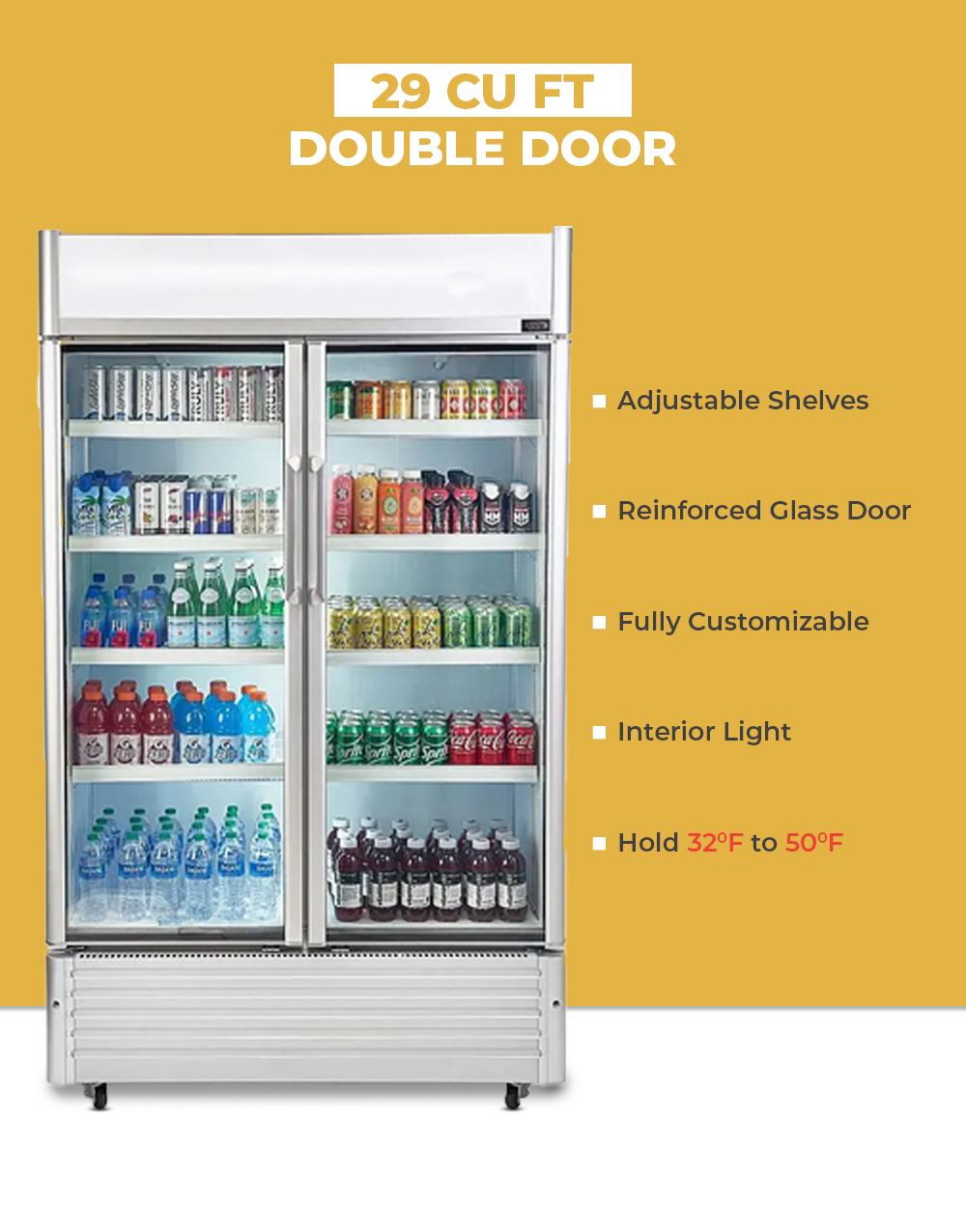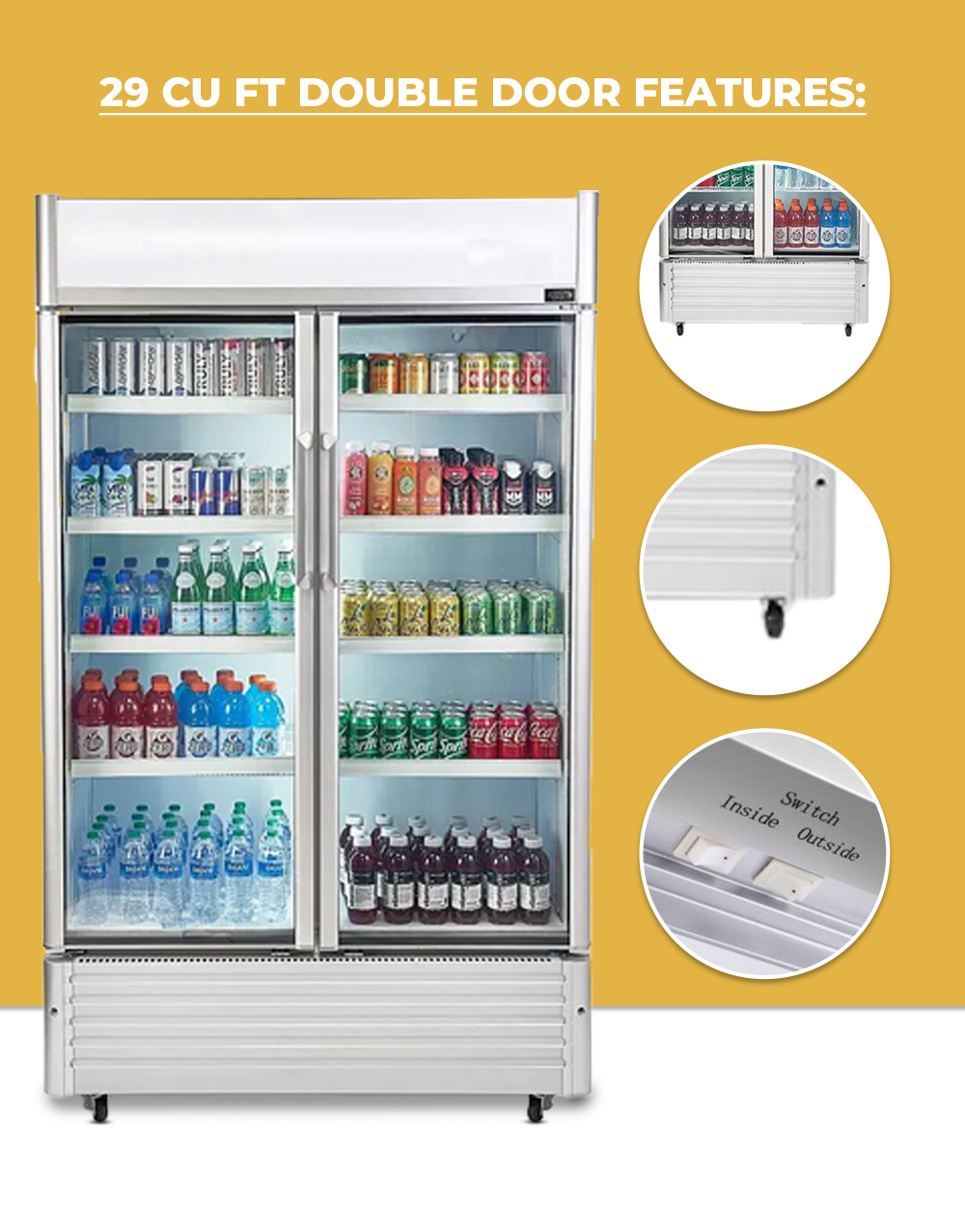 The 29 cu. ft. Doubleglass door refrigerator is built for retail, restaurants, and convenience stores that require reliable cooling and clear product visibility. Its double-layer tempered glass doors provide insulation while showcasing beverages, making it an efficient option for both storage and display.