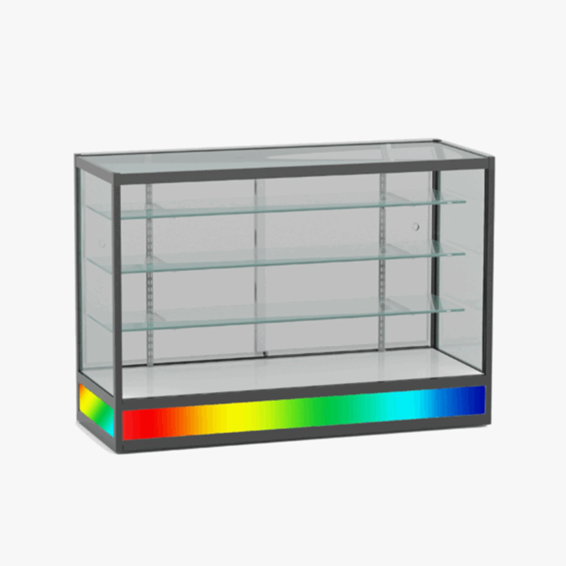 Measuring 48” x 20” x 38” and 72” x 20” x 38” and weighing 300 lbs., this vision Showcase is designed for stability and reliability. Each tempered glass shelf supports up to 30 lbs., allowing you to showcase jewelry, electronics, collectibles, or specialty items with confidence. Equipped with both spotlights and RGB chasing lights at the bottom, this RGB display case enhances visibility and adds a vibrant touch to your presentation.